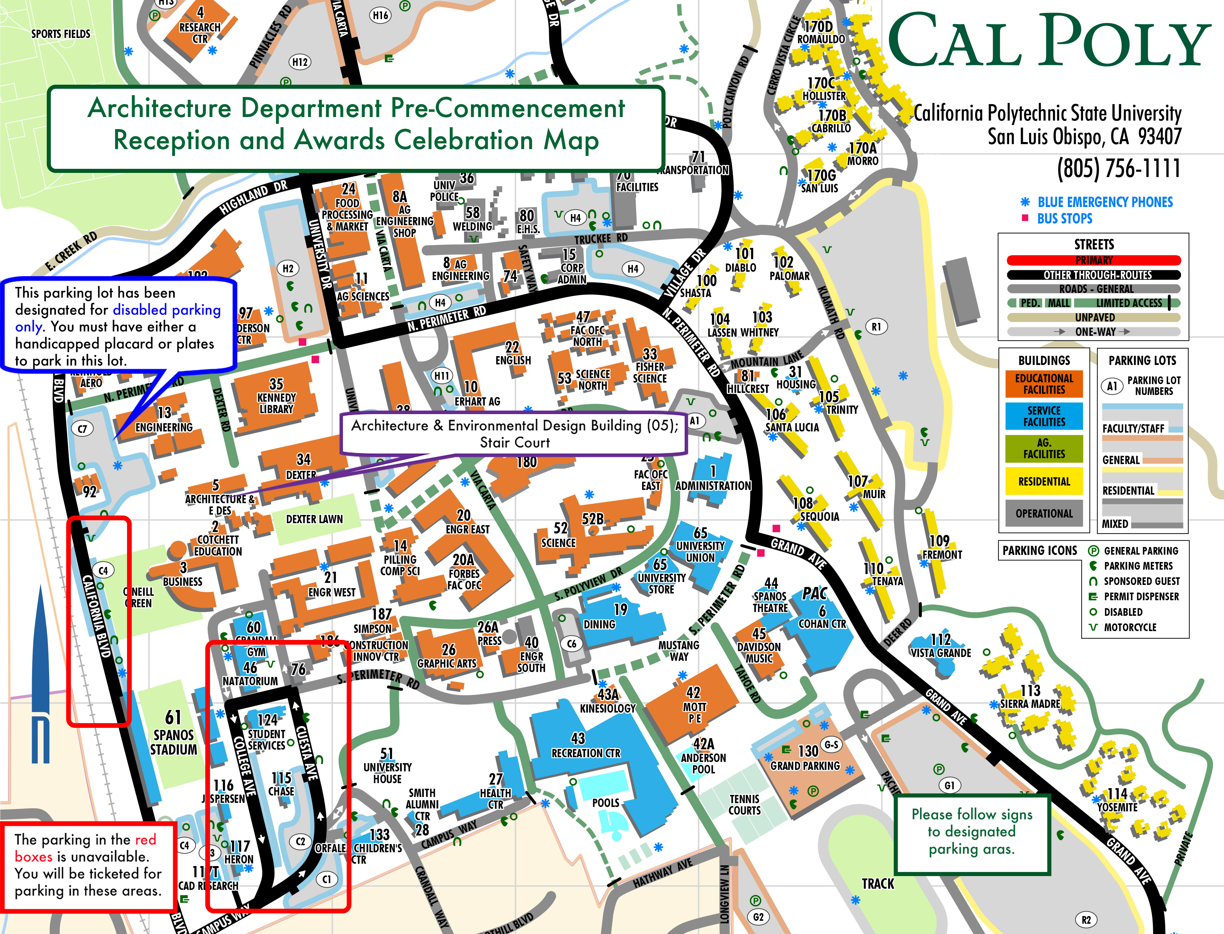 If you or a member of your party needs handicap accommodations, notify the Architecture Department before June 1. Please send an email to architecture@calpoly.edu with the following information: